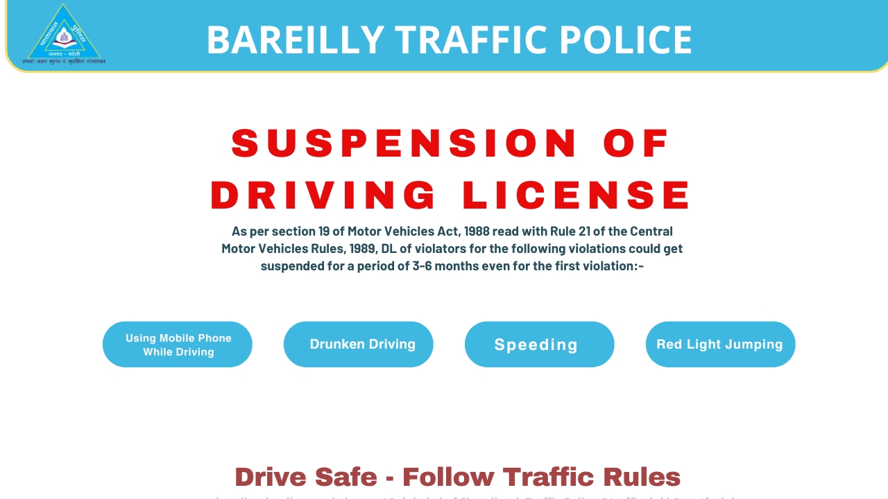 As per the new amendment in Motor Vehicle Act-2019, the Driving License shall be suspended for the following traffic violations:-